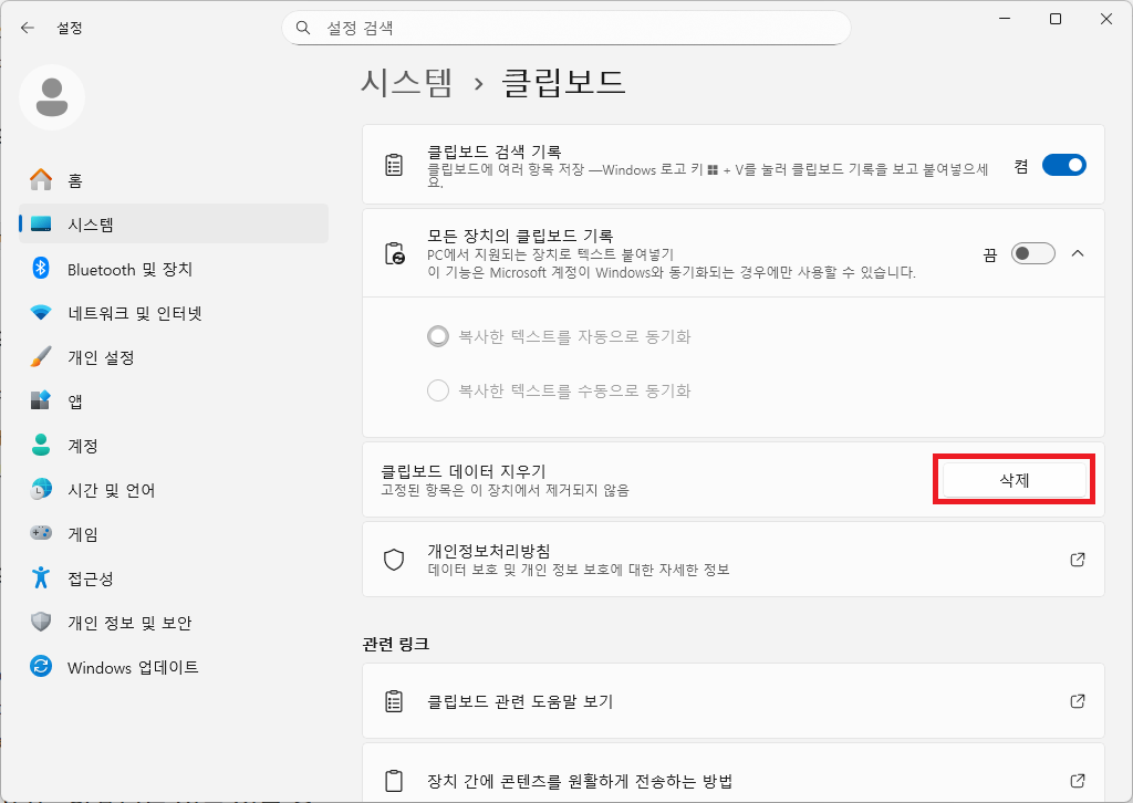 Win + V→ [모두 지우기]- 또는 [설정] → [시스템] → [클립보드] → [클립보드 데이터 지우기]