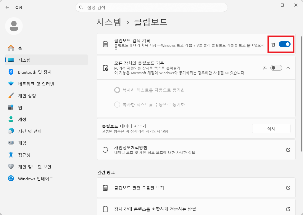 - 또 다른 방법 : 설정 - 시스템 - 클립보드 - 클립보드 검색 기록 - 켬