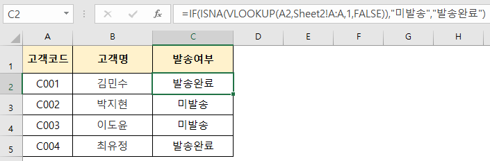 =IF(ISNA(VLOOKUP(A2,Sheet2!A:A,1,FALSE)),"미발송","발송완료")