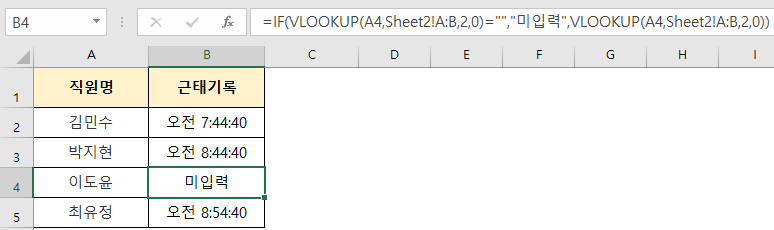 =IF(VLOOKUP(A2,Sheet2!A:B,2,0)="","미입력",VLOOKUP(A2,Sheet2!A:B,2,0))