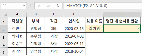 이 수식은 “E2 셀의 이름이 A열 범위에서 몇 번째에 있는가”를 숫자로 반환합니다.
