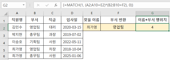 Ctrl + Shift + Enter로 배열 수식으로 입력하면, “이름(E2)과 부서(F2)가 모두 일치하는 행의 위치”를 반환합니다.