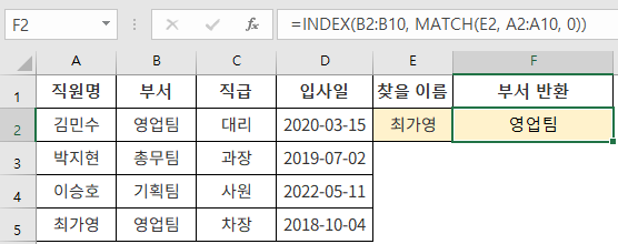 이 수식은 “E2의 이름이 A열에서 몇 번째인지 찾고, 그 순서에 해당하는 B열(부서)을 반환”합니다.