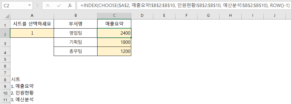 =INDEX(CHOOSE($A$2, 매출요약!$B$2:$B$10, 인원현황!$B$2:$B$10, 예산분석!$B$2:$B$10), ROW()-1)