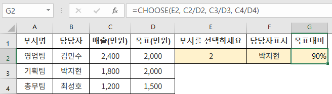 이제 선택된 번호에 따라 자동으로 해당 부서의 담당자와 매출을 표시하도록 수식을 작성합니다 👇