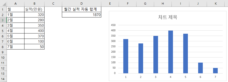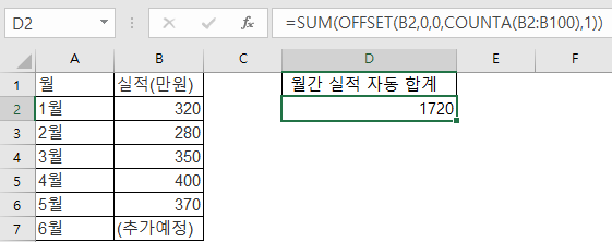 💡 새 달이 추가될 때마다 합계 범위를 수정하지 않고 자동으로 계산되게 하려면 다음 수식을 사용합니다.