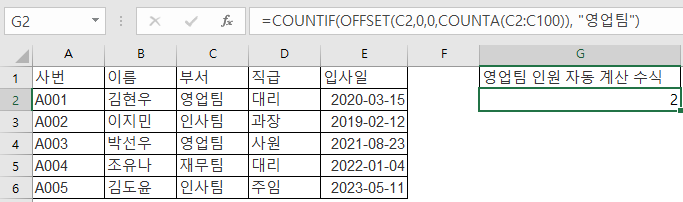 OFFSET과 COUNTIF를 결합해 부서별 인원수를 자동 계산해볼게요.