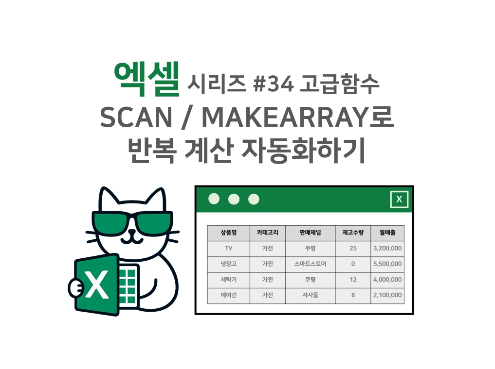 SCAN과 MAKEARRAY는 초보자에게 난해해 보일 수 있지만 실무에서는 시간을 크게 절약하는 매우 강력한 도구입니다. 특히 매출/비용/근무시간 등 누적·반복 데이터가 많은 사무직에는 필수라 할 수 있습니다.