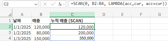 SCAN 함수는 왼쪽에서 오른쪽으로 계산을 반복하면서 누적 결과를 배열로 출력합니다. 예를 들어, 매일 매출이 추가될 때 누적 매출을 자동으로 만들고 싶다면 SCAN 하나로 해결됩니다.