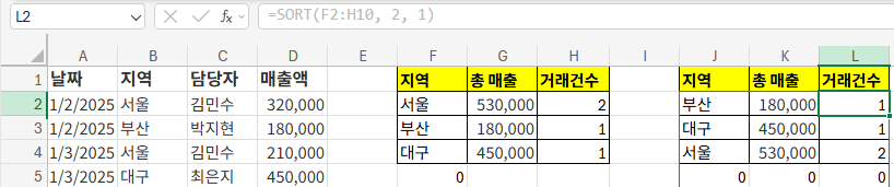 SORT 함수를 사용해 총 매출 기준으로 자동 정렬표를 만들 수 있습니다.