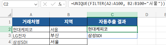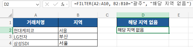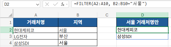 위 수식은 지역이 ‘서울’인 거래처명만 자동으로 표시합니다.