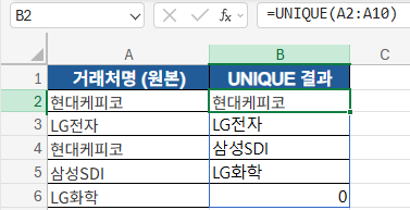 위처럼 입력하면 A2~A10 범위의 고유 거래처 목록이 자동으로 출력됩니다.