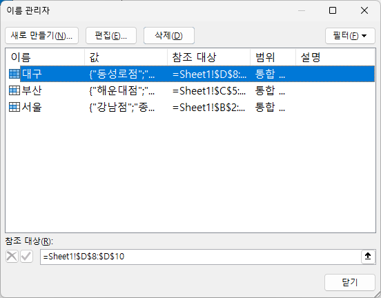 - 대구 지점 목록(D8:D10) → 이름 정의 : 대구