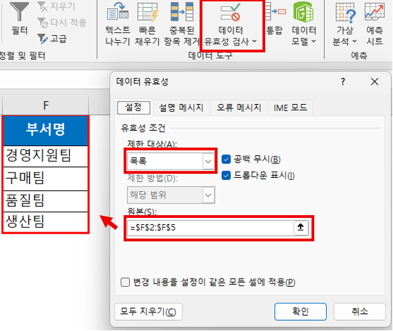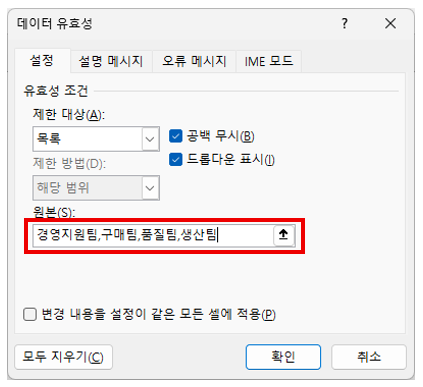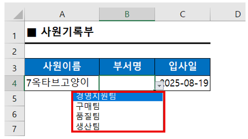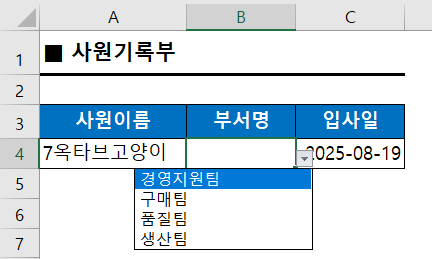 예를 들어, 부서명을 입력할 때 "경영지원팀", "구매팀", "품질팀", "생산팀" 중에서 선택하게 하면 오타 없이 정확한 데이터를 입력할 수 있습니다.
