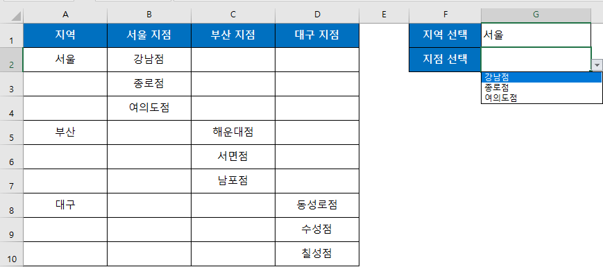- 지역 선택 셀 : G1 → 데이터 유효성 검사 → 목록: 서울,부산,대구