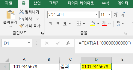 → A1에 1012345678이 있어도 결과는 01012345678