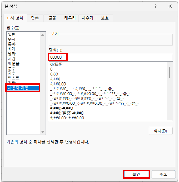 Ctrl + 1 → 셀 서식 → 사용자 지정 → 형식 (코드 자리수에 따라 입력)
