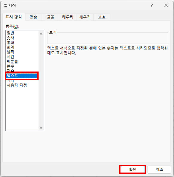 2. 셀 서식을 '텍스트'로 변경