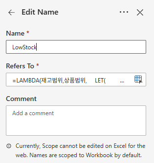 - 이름(Name Manager) : LowStock (원하는 이름 가능, 공백 없이)라는 이름으로 저장
