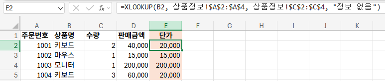 =XLOOKUP(B2, 상품정보!$A$2:$A$4, 상품정보!$C$2:$C4$, "정보 없음")