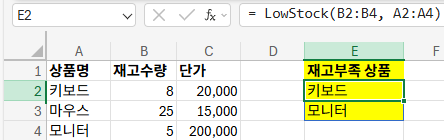 - 시트에서 = LowStock(B2:B4, A2:A4) → 재고 부족 상품 리스트 반환