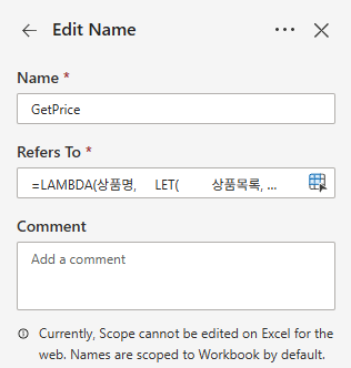 - 이름(Name Manager) : GetPrice (원하는 이름 가능, 공백 없이)라는 이름으로 저장