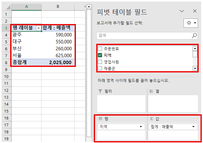ⓒ7옥타브고양이 : 지역별 매출 합계 피벗 테이블 적용