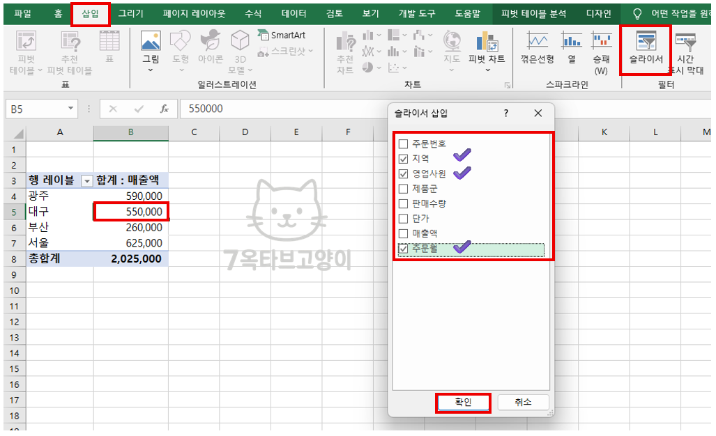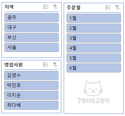 ⓒ7옥타브고양이 : 슬라이서 생성 완료 (지역, 영업사원, 주문월)