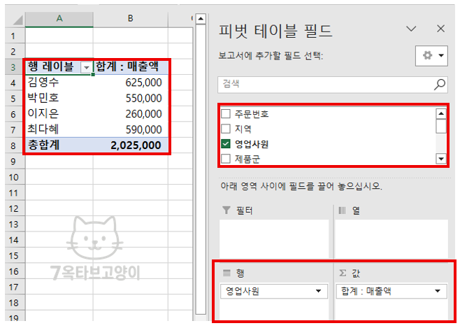 ⓒ7옥타브고양이 : 영업사원별 매출 실적 피벗 테이블 적용
