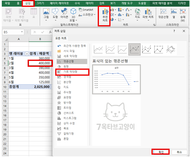 • 만들어 놓은 월별 매출 추이 피벗테이블 선택 → 삽입 → 추천 차트 →  꺾은선 → 확인