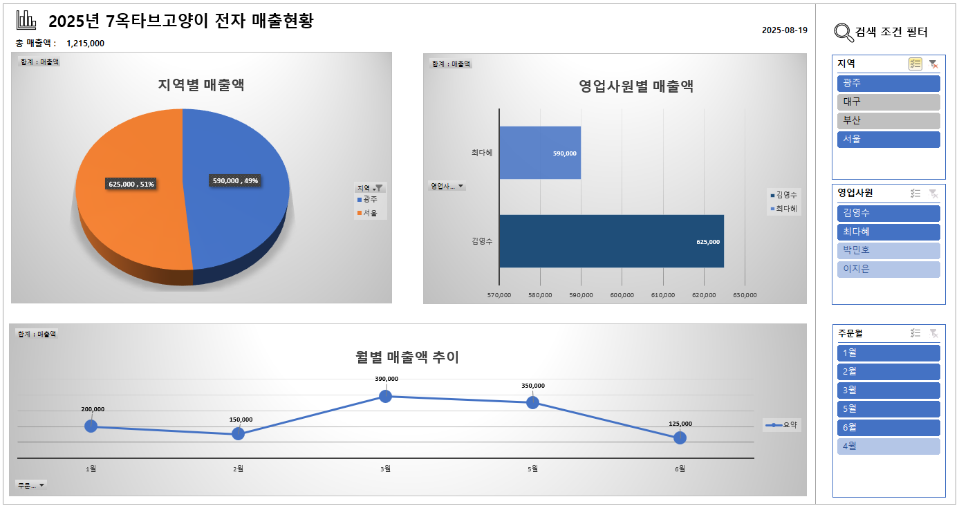 여기서 우리는 피벗 테이블과 차트를 활용해 지역별 매출, 영업사원별 실적, 월별 트렌드를 분석하는 대시보드를 만들어 보겠습니다.