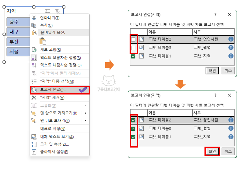 • 지역 슬라이서 선택 → 마우스 오른쪽 버튼→ 보고서 연결→  아래 사진과 같이 2개의 피벗 테이블 체크 → 확인