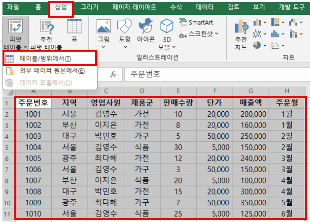 주문번호 지역 영업사원 제품군 판매수량 단가 매출액 주문월