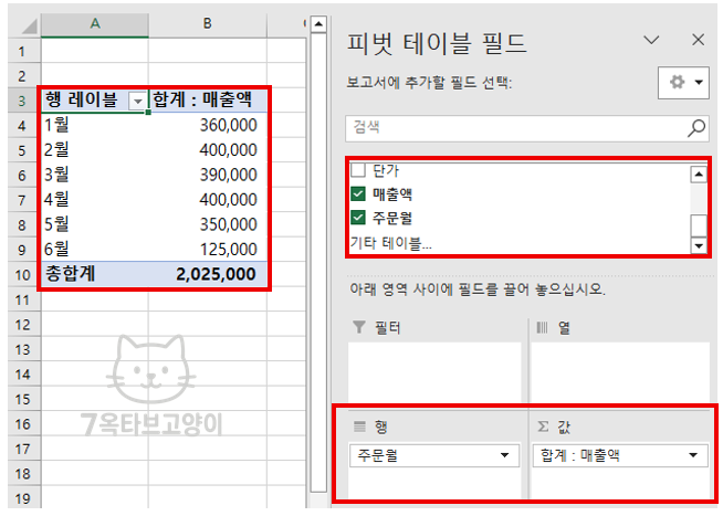 ⓒ7옥타브고양이 : 월별 매출 추이 피벗 테이블 적용